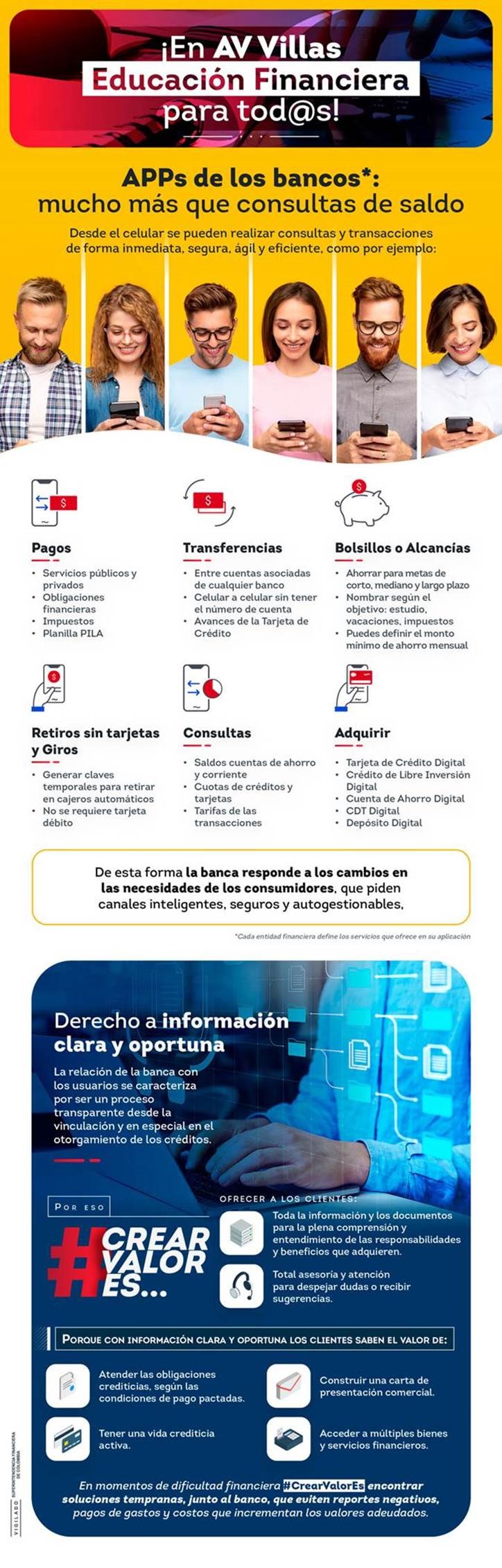 - Tener a su disposición, en los términos establecidos en la presente ley y en las demás disposiciones de carácter especial, publicidad e información transparente, clara, veraz, oportuna y verificable, sobre las características propias de los productos o servicios ofrecidos y/o suministrados. En particular, la información suministrada por el Banco AV Villas deberá ser de tal que permita y facilite su comparación y comprensión frente a los diferentes productos y servicios ofrecidos en el mercado.